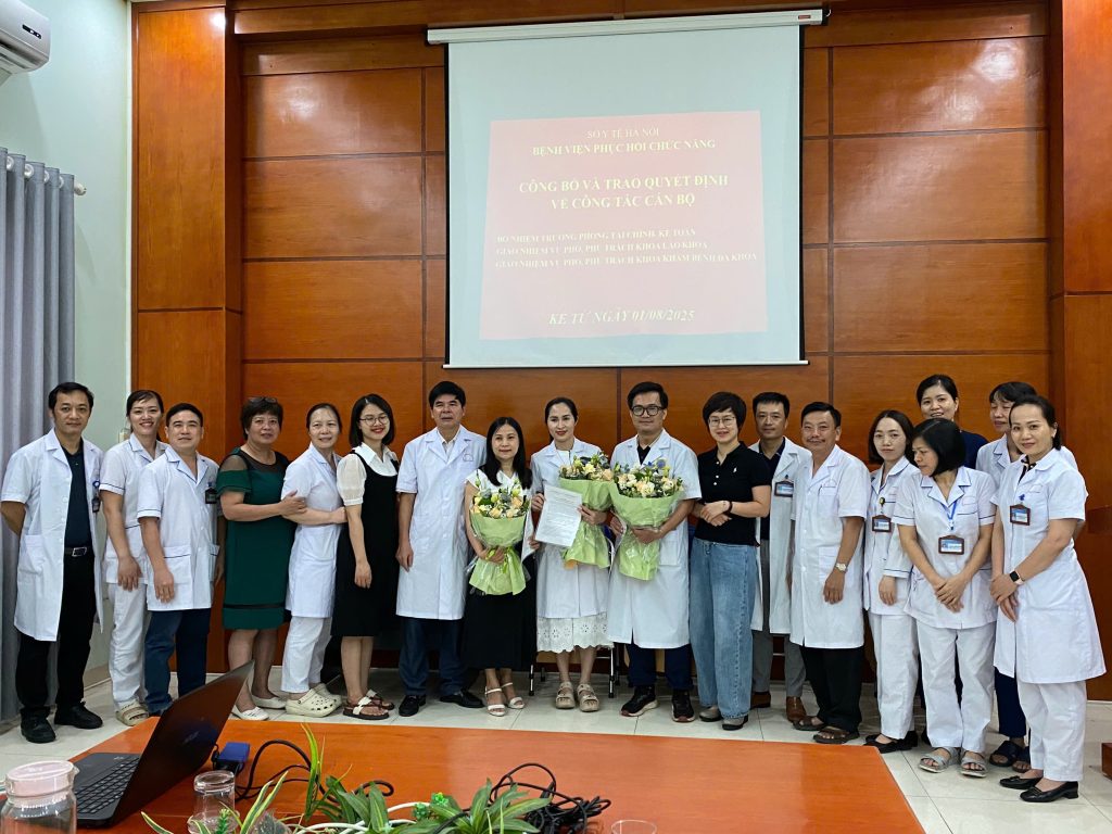 Sáng ngày 01/08/2025, Bệnh viện Phục hồi chức năng đã trang trọng tổ chức Lễ công bố và trao các quyết định bổ nhiệm, giao nhiệm vụ cho cán bộ quản lý. Buổi lễ có sự hiện diện của Đảng ủy, Ban Giám đốc, cùng các cán bộ chủ chốt của bệnh viện.