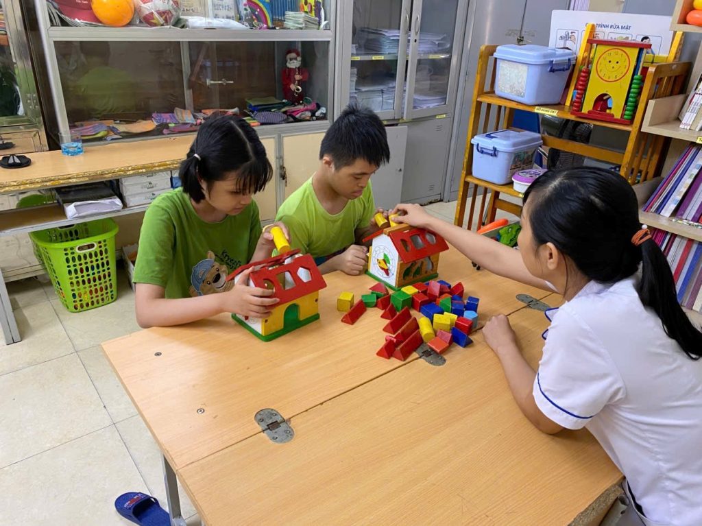 Hỗ trợ trẻ phát triển về vận động như: vận động tinh (cài cúc, kéo khóa quần áo, xâu hạt, xếp, gắp hình nhỏ, cầm thìa, cầm bút…..) phát triển vận động thô như: chuyền bóng, đạp xe, tập đi cầu thang gỗ, bập bênh, xích đu…phát triển kỹ năng học đường, kỹ năng sống, phát triển kỹ năng giao tiếp, tương tác, quan hệ xã hội bằng các hình thức như: can thiệp theo nhóm lớp, can thiệp cá nhân phù hợp với khả năng của từng trẻ.