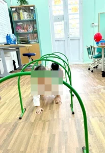 Cháu Nguyễn Tiến Đạt (Hà Nam) 5 tuổi, vào bệnh viện Phục hồi chức năng Hà Nội điều trị trong tình trạng: giao tiếp mắt kém, ít đáp ứng khi gọi tên, thường chơi một mình, chạy vòng tròn, có hành vi tìm kiếm cảm giác về âm thanh, liên tục chạy nhảy. Trẻ đã nói được một số từ đơn, biết làm các hoạt động tự chăm sóc đơn giản. Bác sĩ chẩn đoán: Rối loạn phổ tự kỷ mức độ nặng, khuyết tật trí tuệ mức độ trung bình. Sau 3 tháng can thiệp, trẻ bớt tăng động, hợp tác tốt với cô trong các buổi học, khả năng giao tiếp không lời của trẻ tiến bộ rõ rệt, trẻ nói được nhiều từ đơn hơn. Chị Mai, mẹ của cháu, cũng được các bác sĩ hướng dẫn cách dạy con trong nhiều hoạt động hàng ngày khác.