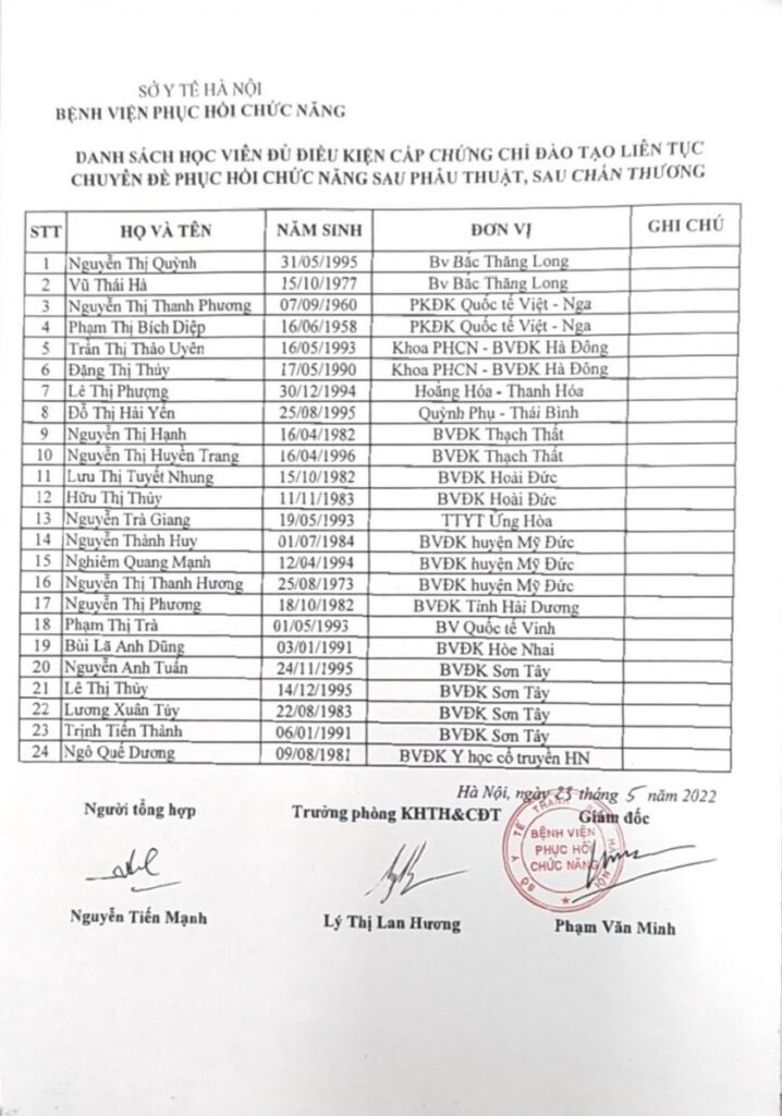 Danh sách học viên được cấp chứng chỉ đào tạo liên tục chuyên đề “Phục hồi chức năng sau phẫu thuật, sau chấn thương” 50 tiết học: 25 tiết lý thuyết, 25 tiết thực hành.