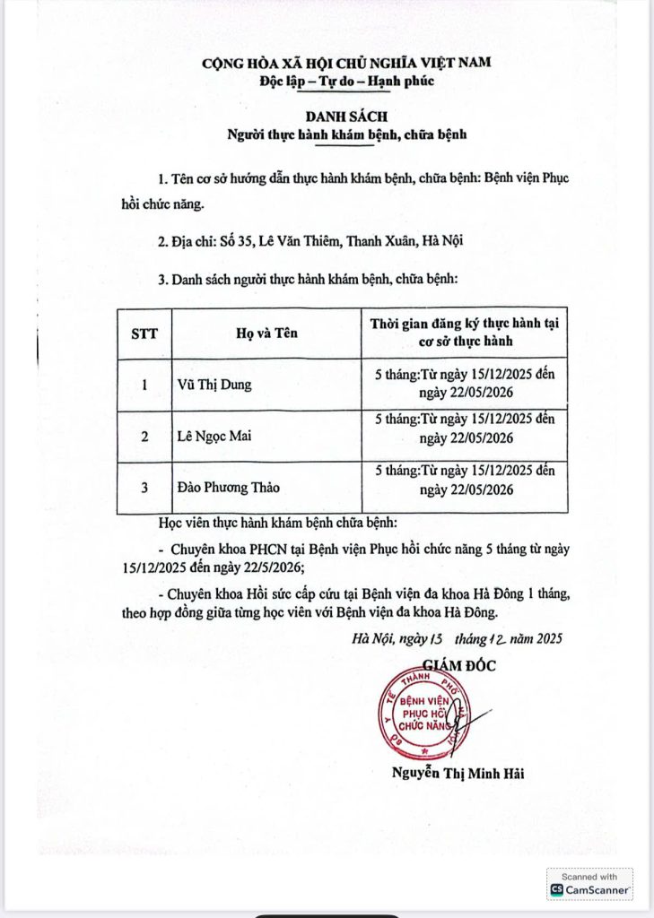 Trang chủ » Tin tức » Danh sách người thực hành khám bệnh, chữa bệnh Danh sách người thực hành khám bệnh, chữa bệnh Đăng vào ngày 15/12/2025 lúc: 11:09 49 lượt xem Chi tiết danh sách: CamScanner 15-12-25 10.56 Có thể bạn quan tâm: Lịch tuần từ 14/7 đến 20/7/2025 (14/07/2025) Thông báo kết quả chỉ định thầu: Gói thầu số 1: Tư vấn Lập E-HMST, đánh giá E-HSDT cho gói thầu số 03 thuộc Dự toán mua sắm thực phẩm năm 2025 cho các cháu khuyết tật Làng Hoà Bình Thanh Xuân (31/07/2025) Sự hồi phục kỳ diệu của bệnh nhi tổn thương não do sốc nhiễm khuẩn (21/03/2025) Khám sức khỏe cho trẻ em khuyết tật (26/09/2023) THƯ MỜI CUNG CẤP BÁO GIÁ MUA SẮM ĐỘT XUẤT VĂN PHÒNG PHẨM VÀ VẬT TƯ TIÊU HAO HÀNH CHÍNH PHỤC VỤ HOẠT ĐỘNG CỦA BỆNH VIỆN NĂM 2025 (07/11/2025) Lịch tuần 25/8 đến 31/8/2025 (26/08/2025) Bệnh viện Phục hồi chức năng tổ chức Lễ công bố và trao quyết định bổ nhiệm, giao nhiệm vụ cán bộ quản lý (02/08/2025) Lịch tuần từ 26/05 đến 01/06/2025 (27/05/2025) BỆNH VIỆN PHỤC HỒI CHỨC NĂNG THAM DỰ HỘI THI “CÁN BỘ CÔNG CHỨC, VIÊN CHỨC LAO ĐỘNG NGÀNH Y TẾ THỦ ĐÔ THANH LỊCH – TẬN TÂM – CHUYÊN NGHIỆP” (17/02/2025) THƯ MỜI BÁO GIÁ DỰ TOÁN CUNG CẤP DỊCH VỤ TỔ CHỨC TIỆC TẤT NIÊN NĂM 2024 (16/12/2024) Bẹt chân ở trẻ: nguyên nhân, cách nhận biết và điều trị (27/07/2023) Lịch tuần từ 12/8-18/8/2024 (12/08/2024) Bệnh viện Phục hồi chức năng Hà Nội tiếp nhận Tình nguyện viên phái cử thuộc Cơ quan hợp tác quốc tế Nhật Bản (JICA) đến làm việc tại bệnh viện. (25/07/2024) Lịch tuần từ 13/01 đến 19/01/2025 (14/01/2025) Danh sách người thực hành khám bệnh, chữa bệnh (15/12/2025)