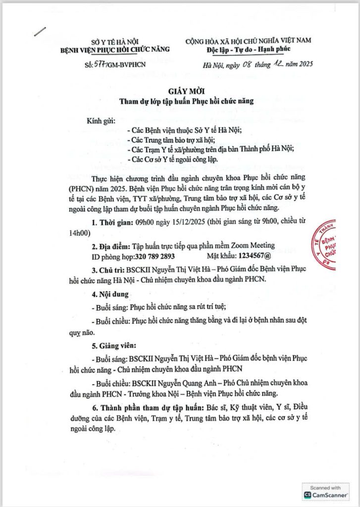 GIẤY MỜI THAM DỰ LỚP TẬP HUẤN PHỤC HỒI CHỨC NĂNG