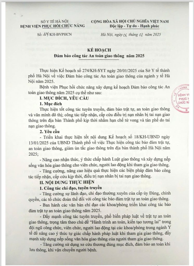 Bệnh viện Phục hồi chức năng xây dựng Kế hoạch Đảm bảo công tác An toàn giao thông năm 2025 như sau: