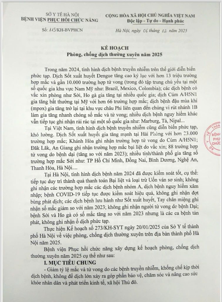 Bệnh viện Phục hồi chức năng xây dựng kế hoạch phòng, chống dịch thường xuyên năm 2025 cụ thể như sau: