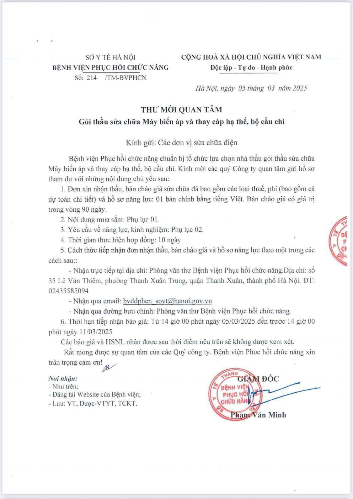 - Thư mời: Gói thầu Tổ chức nghỉ dưỡng cho viên chức, người lao động Bệnh viện Phục hồi chức năng năm 2025 (06/06/2025)