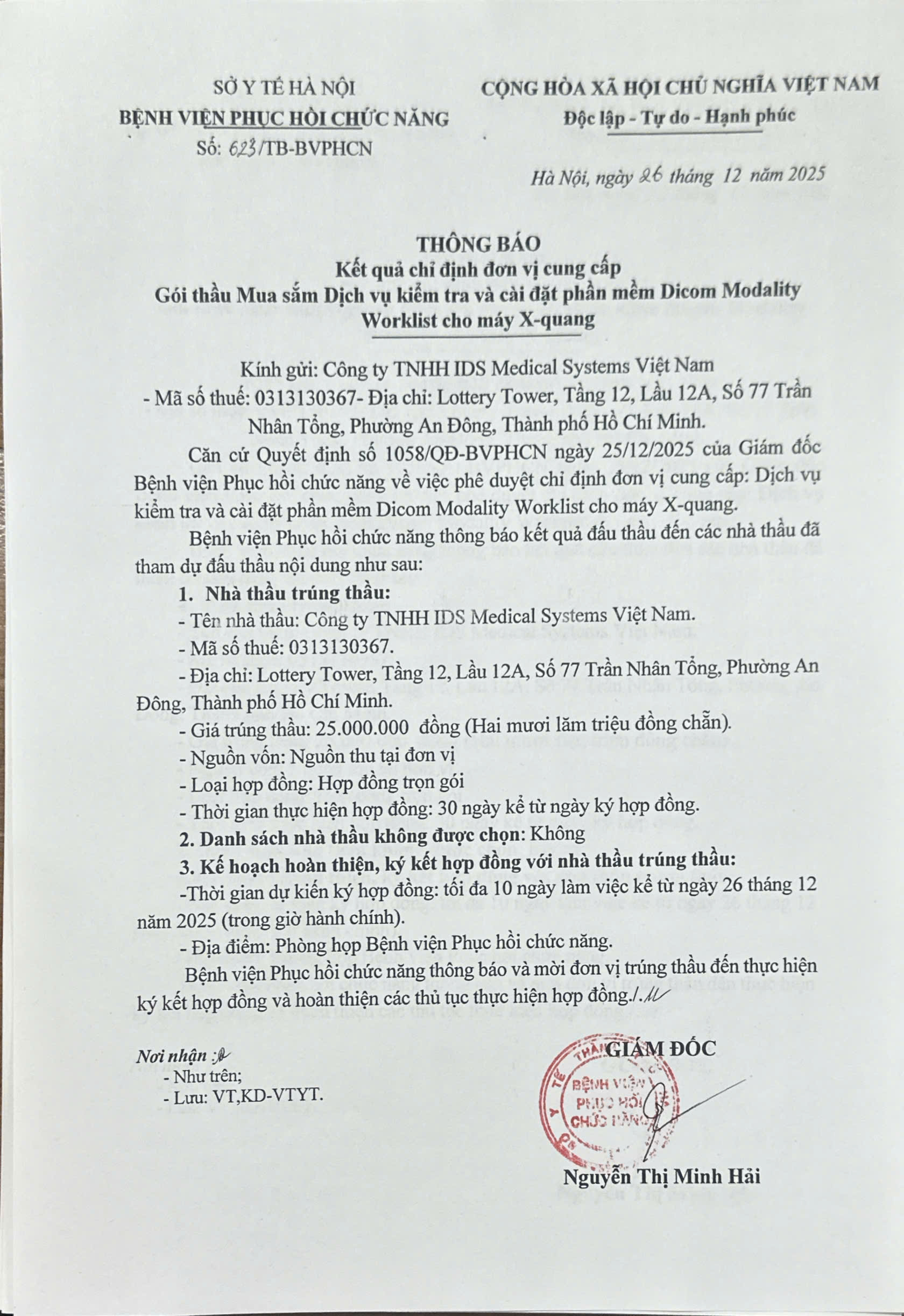 - THƯ MỜI VỀ VIỆC ĐỀ NGHỊ CUNG CẤP HỒ SƠ NĂNG LỰC VÀ BÁO GIÁ PHỤC VỤ HOẠT ĐỘNG THẨM ĐỊNH GIÁ ĐỐI VỚI TÀI SẢN THANH LÝ CỦA BỆNH VIỆN PHỤC HỒI CHỨC NĂNG (26/11/2025)