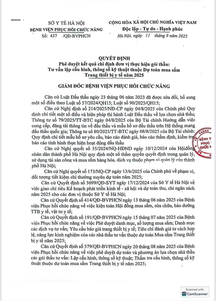 QUYẾT ĐỊNH: Phê duyệt kết quả chỉ định đơn vị thực hiện gói thầu: Tư vấn lập cấu hình, thông số kỹ thuật thuộc Dự toán mua sắm Trang thiết bị năm 2025