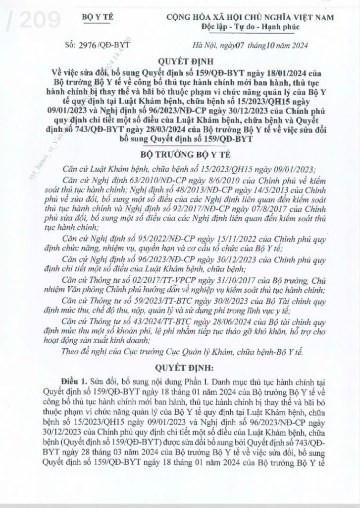 Quyết định số 2976/QĐ-BYT ngày 07/10/2024 của Bộ Y Tế công bố thủ tục hành chính sửa đổi, bổ sung Quyết định số 159/QĐ-BYT ngày 18/01/2024 của Bộ trưởng Bộ Y tế về công bố thủ tục hành chính mới ban hành, thủ tục hành chính bị thay thế và bãi bỏ thuộc phạm vi chức năng quản lý của Bộ Y tế quy định tại Luật Khám bệnh, chữa bệnh số 15/2023/QH15 ngày 09/01/2023 và Nghị định số 96/2023/NĐ-CP ngày 30/12/2023 của Chính phủ quy định chi tiết một số điều của Luật Khám bệnh, chữa bệnh và…