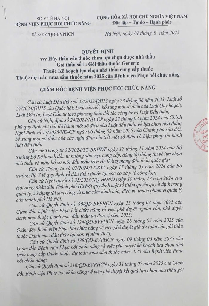 QUYẾT ĐỊNH: v/v Hủy thầu các thuốc chưa được lựa chọn được nhà thầu Gói thầu số 1: Gói thầu thuốc Generic Thuộc Kế hoạch lựa chọn nhà thầu cung cấp thuốc Thuộc dự toán mua sắm thuốc năm 2025 của Bệnh viện Phục hồi chức năng