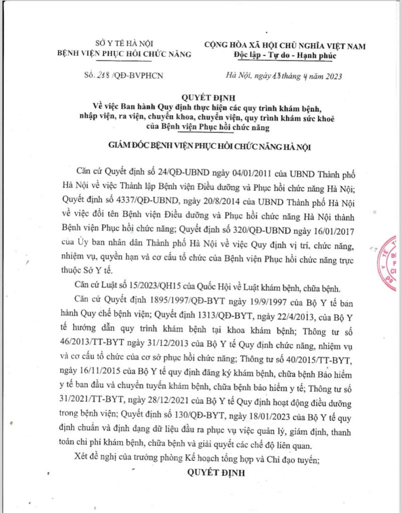 Chi tiết File đính kèm: so 218.QĐ-BVPHCN Quyet dinh ban hanh quy dinh thuc hien cac quy trinh kham benh…của BV PHCN (3)