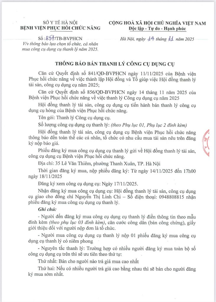 Trang chủ » Tin tức » THÔNG BÁO BÁN THANH LÝ CÔNG CỤ DỤNG CỤ THÔNG BÁO BÁN THANH LÝ CÔNG CỤ DỤNG CỤ Đăng vào ngày 14/11/2025 lúc: 13:30 87 lượt xem Chi tiết thông báo: 857 Có thể bạn quan tâm: THƯ MỜI BÁO GIÁ VỀ VIỆC SỬA CHỮA MÁY ĐO MẬT ĐỘ XƯƠNG TOÀN THÂN (26/08/2024) Khoa Chẩn đoán hình ảnh – Thăm dò chức năng (07/08/2023) BỆNH VIỆN PHỤC HỒI CHỨC NĂNG THAM DỰ HỘI THI “CÁN BỘ CÔNG CHỨC, VIÊN CHỨC LAO ĐỘNG NGÀNH Y TẾ THỦ ĐÔ THANH LỊCH – TẬN TÂM – CHUYÊN NGHIỆP” (17/02/2025) THƯ MỜI BÁO GIÁ DỊCH VỤ TƯ VẤN LẬP E-HSMT, BÁO CÁO ĐÁNH GIÁ E-HSDT CHO DỰ TOÁN MUA SẮM “TRANG PHỤC Y TẾ VÀ ĐỒ VẢI PHỤC VỤ BỆNH NHÂN NĂM 2025” (31/10/2025) Lịch tuần từ 22/04 đến 28/04/2024 (24/04/2024) Lich tuan tu 15/9 den 21/9/2025 (17/09/2025) Lịch tuần từ 16.6.2025 đến 22.6.2025 (17/06/2025) Lịch tuần từ 07/10 đến 13/10/2024 (06/10/2024) THƯ MỜI QUAN TÂM GÓI THẦU MUA SẮM MÁY TÍNH ĐỂ BÀN, MÁY IN NĂM 2024 (21/08/2024) Công bố danh sách học viên (25/09/2023) Lịch tuần từ 21/10/2024 đến 27/10/2024 (24/10/2024) GIAO BAN CÔNG TÁC ĐẦU NGÀNH QUÝ II VÀ TẬP HUẤN “PHỤC HỒI CHỨC NĂNG RỐI LOẠN TIỂU TIỆN”, ” NIỆU ĐỘNG HỌC” (01/08/2024) Lịch tuần từ 11/8 đến 17/8/2025 (09/08/2025) THÔNG BÁO KẾT QUẢ CHỈ ĐỊNH ĐƠN VỊ THỰC HIỆN: Gói thầu: Tư vấn thẩm tra cấu hình, thông số kỹ thuật thuộc Dự toán mua sắm Trang thiết bị y tế năm 2025 (12/09/2025) Lịch tuần từ 09/06 đến 15/06/2025 (09/06/2025)