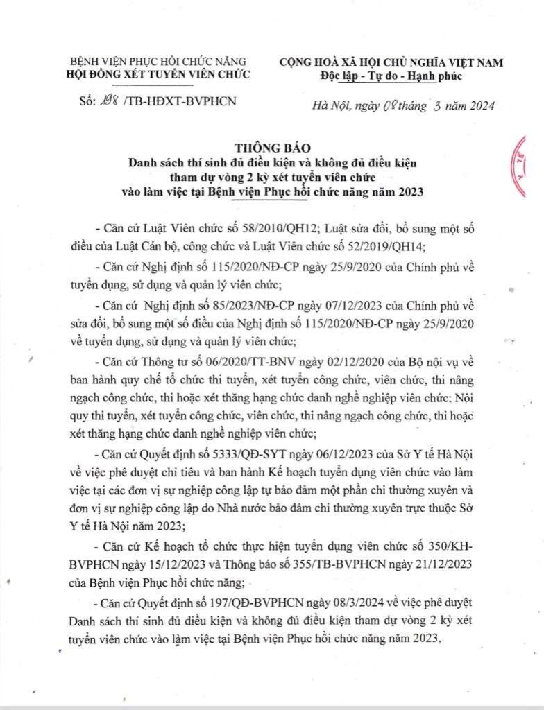 Hội đồng xét tuyển viên chức vào làm việc tại Bệnh viện Phục hồi chức năng năm 2023 thông báo danh sách thí sinh đủ điều kiện, không đủ điều kiện tham dự vòng 2 kỳ xét tuyển viên chức năm 2023 như sau: