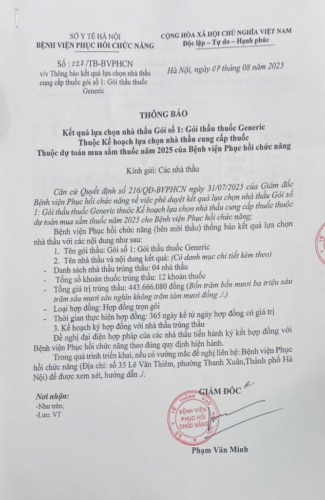 THÔNG BÁO: Kết quả lựa chọn nhà thầu Gói số 1: Gói thầu thuốc Generic Thuộc Kế hoạch lựa chọn nhà thầu cung cấp thuốc Thuộc dự toán mua sắm thuốc năm 2025 của Bệnh viện Phục hồi chức năng