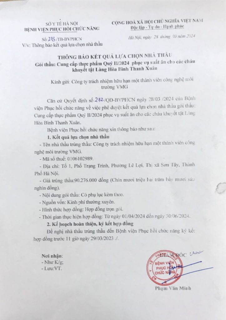THÔNG BÁO KẾT QUẢ LỰA CHỌN NHÀ THẦU GÓI THẦU CUNG CẤP THỰC PHẨM QUÝ II/2024 PHỤC VỤ SUẤT ĂN CHO CÁC CHÁU KHUYẾT TẬT LÀNG HÒA BÌNH THANH XUÂN