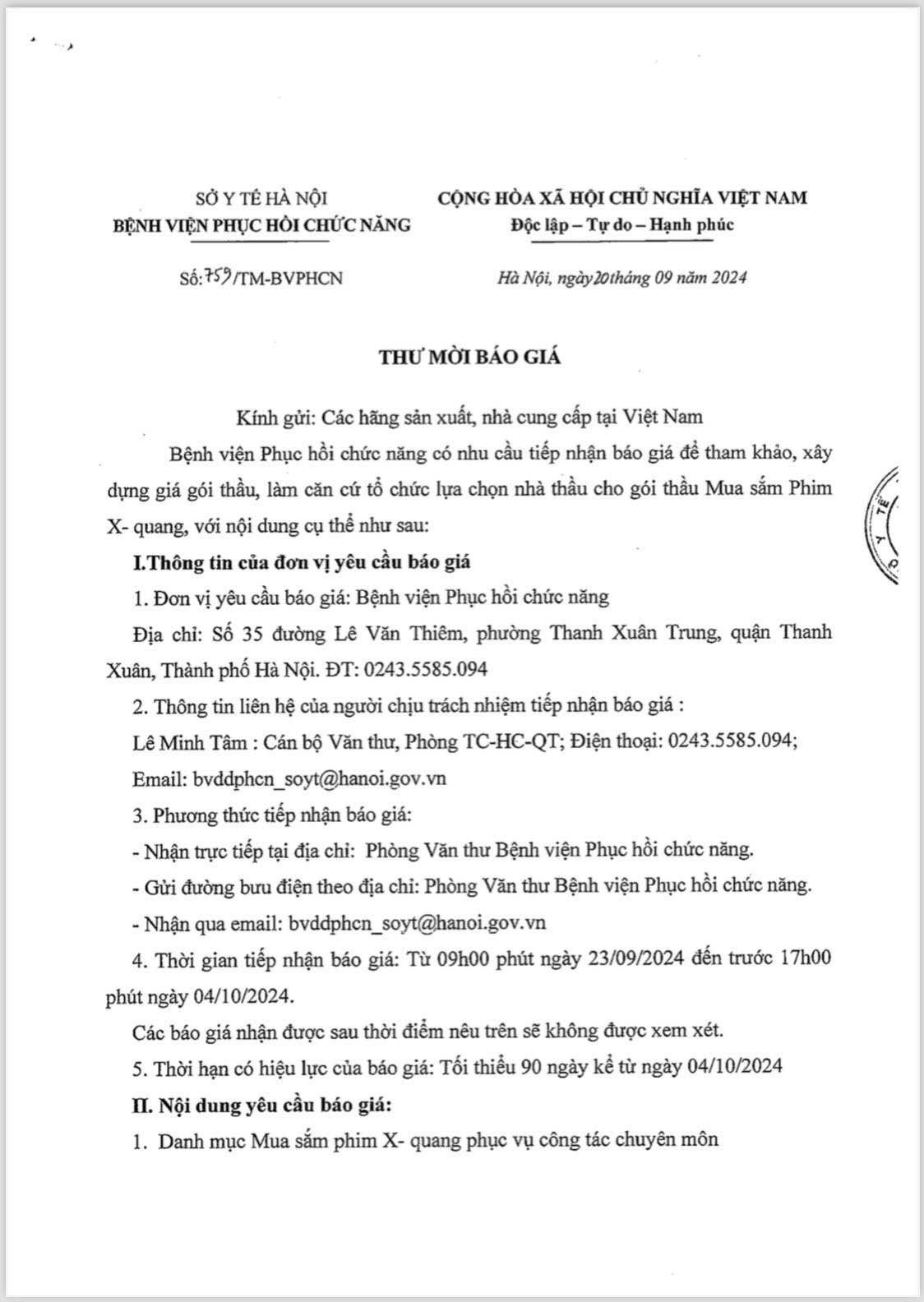 - Thư mời báo giá lần 2: Dịch vụ Tư vấn thẩm tra cấu hình, thông số kỹ thuật cho dự toán mua sắm Trang thiết bị y tế năm 2025 (12/08/2025)