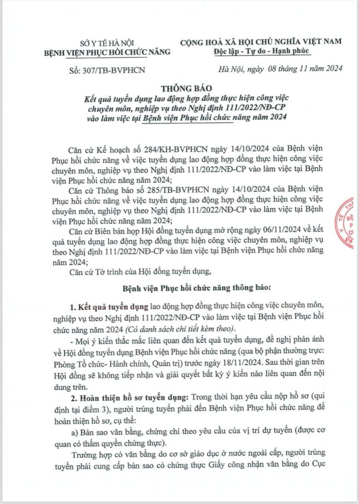 THÔNG BÁO KẾT QUẢ TUYỂN DỤNG LAO ĐỘNG HỢP ĐỒNG THỰC HIỆN CÔNG VIỆC CHUYÊN MÔN, NGHIỆP VỤ THEO NGHỊ ĐỊNH 111/2022/NĐ-CP VÀO LÀM VIỆC TẠI BỆNH VIỆN PHỤC HỒI CHỨC NĂNG NĂM 2024