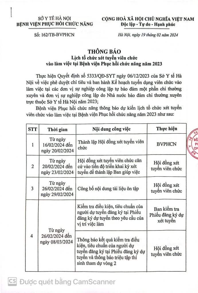 Ngày 19/02/2024, Bệnh viện Phục hồi chức năng gửi thông báo dự kiến lịch tổ chức xét tuyển viên chức vào làm việc tại Bệnh viện Phục hồi chức năng năm 2023 như sau: