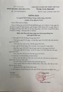 Trang chủ » Tin tức » THÔNG BÁO: V/v nghỉ lễ Giỗ tổ Hùng Vương, Chiến thắng 30/4/2025 và Quốc tế lao động 1/5/2025 THÔNG BÁO: V/v nghỉ lễ Giỗ tổ Hùng Vương, Chiến thắng 30/4/2025 và Quốc tế lao động 1/5/2025 Đăng vào ngày 02/04/2025 lúc: 16:24 1010 lượt xem Chi tiết thông báo: lịch 30-4 1-5 Có thể bạn quan tâm: Bệnh Sởi và cách phòng ngừa (10/10/2024) BỆNH VIỆN PHỤC HỒI CHỨC NĂNG THAM DỰ HỘI THI “CÁN BỘ CÔNG CHỨC, VIÊN CHỨC LAO ĐỘNG NGÀNH Y TẾ THỦ ĐÔ THANH LỊCH – TẬN TÂM – CHUYÊN NGHIỆP” (17/02/2025) THƯ MỜI YÊU CẦU TƯ VẤN KHẢO SÁT LẬP DỰ TOÁN MUA SẮM PHẦN MỀM BỆNH ÁN ĐIỆN TỬ – THIẾT BỊ HẠ TẦNG CÔNG NGHỆ THÔNG TIN (17/04/2025) Phòng Kế hoạch tổng hợp & Chỉ đạo tuyến (23/02/2024) Lịch tuần từ 25/03/2024 đến 31/03/2024 (27/03/2024) THƯ MỜI BÁO GIÁ DỰ TOÁN MUA SẮM THỰC PHẨM THÁNG 7,8 NĂM 2024 (11/06/2024) 7 LOẠI HẠT GIÀU CANXI NHẤT – BỔ SUNG NGAY CHO XƯƠNG CHẮC KHỎE! 🔥 (10/04/2025) THƯ MỜI BÁO GIÁ DỊCH VỤ TƯ VẤN THẨM ĐỊNH GIÁ (11/06/2024) THÔNG BÁO: Về việc triển khai thực hiện điều trị nội trú ban ngày tại Bệnh viện Phục hồi chức năng Hà Nội (17/11/2025) QUYẾT ĐỊNH Về việc phê duyệt kế hoạch lựa chọn nhà thầu Dự toán mua sắm trang thiết bị y tế năm 2025 (21/11/2025) THÔNG BÁO: Về việc công bố cơ sở khám bệnh, chữa bệnh đáp ứng yêu cầu là cơ sở thực hành (02/04/2025) THÔNG BÁO KẾT QUẢ XÉT TUYỂN VIÊN CHỨC (VÒNG 2) (02/05/2024) Lịch tuần từ 28/04 đến 04/5/2025 (28/04/2025) Bẹt chân ở trẻ: nguyên nhân, cách nhận biết và điều trị (27/07/2023) THƯ MỜI QUAN TÂM GÓI THẦU: TƯ VẤN GIÁM SÁT CUNG CẤP VÀ LẮP ĐẶT TRANG THIẾT BỊ THUỘC DỰ TOÁN MUA SẮM TRANG THIẾT BỊ Y TẾ NĂM 2024 (19/11/2024)