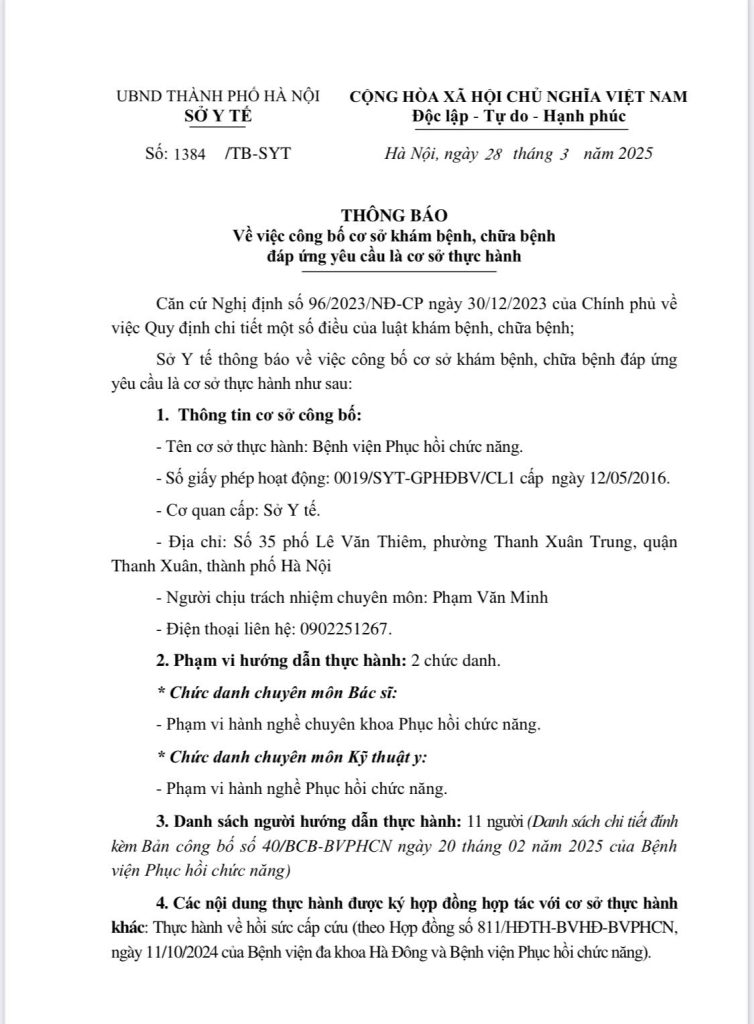 THÔNG BÁO: Về việc công bố cơ sở khám bệnh, chữa bệnh đáp ứng yêu cầu là cơ sở thực hành