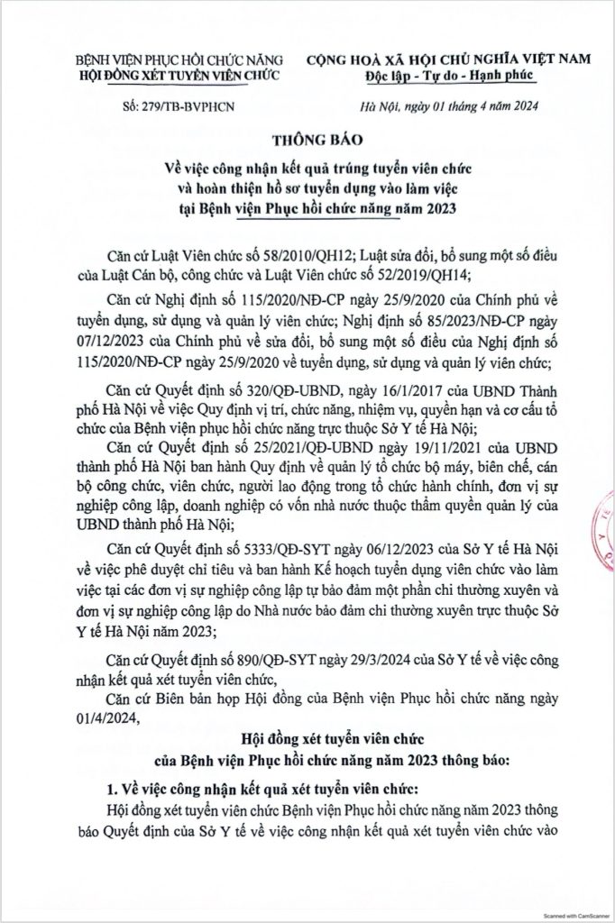 Hội đồng xét tuyển viên chức Bệnh viện Phục hồi chức năng năm 2023 thông báo Quyết định của Sở Y tế về việc công nhận kết quả xét tuyển viên chức vào làm việc tại Bệnh viện Phục hồi chức năng năm 2023 đối với 04 thí sinh, trong đó số thí sinh trúng tuyển là 04 (bốn) người. (Có Quyết định số 890/QĐ-SYT ngày 29/3/2024 của SỞ Y tế về việc công nhận kết quả xét tuyển viên chức kèm theo)
