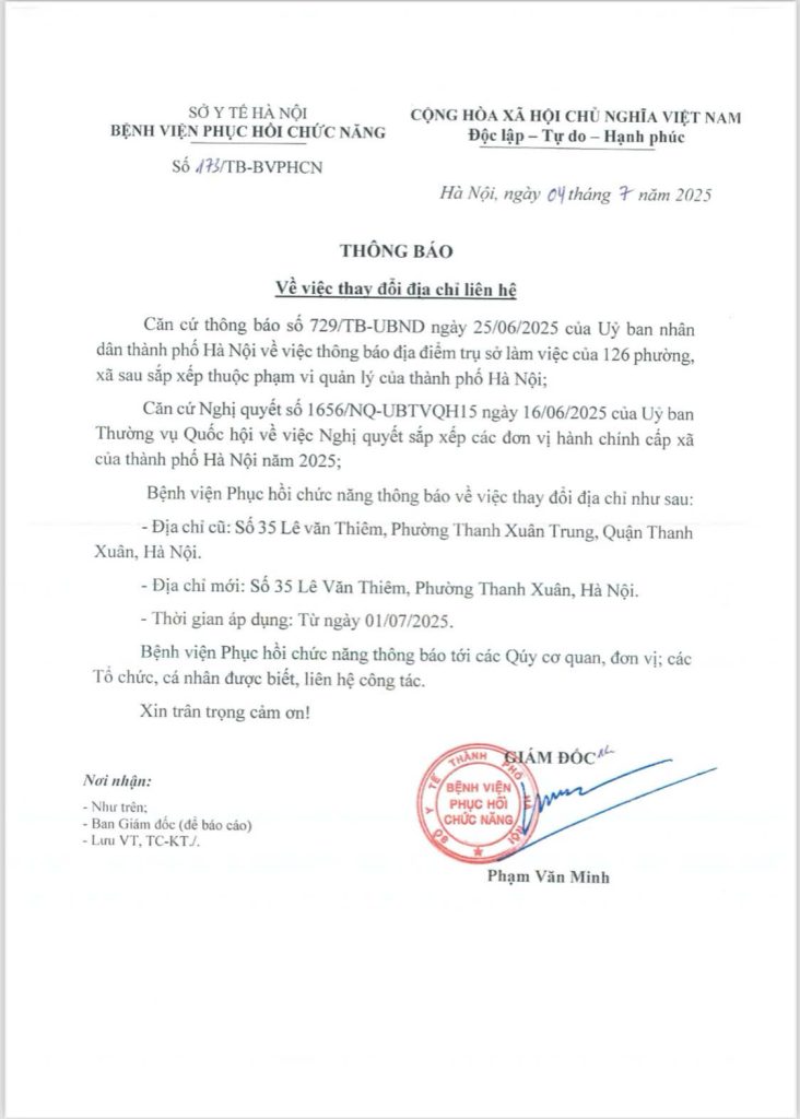 Trang chủ » Tin tức » Hoạt động bệnh viện » THÔNG BÁO VỀ VIỆC THAY ĐỔI ĐỊA CHỈ LIÊN HỆ THÔNG BÁO VỀ VIỆC THAY ĐỔI ĐỊA CHỈ LIÊN HỆ Đăng vào ngày 08/07/2025 lúc: 08:28 694 lượt xem Bệnh viện Phục hồi chức năng Hà Nội trân trọng thông báo tới quý khách hàng về việc thay đổi địa chỉ liên hệ như sau: Có thể bạn quan tâm: THƯ MỜI BÁO GIÁ: Gói thầu mua hóa chất cho máy sinh hóa BX-300 (05/11/2025) Lịch tuần từ 02/9 đến 08/09/2024 (05/09/2024) Phòng Điều dưỡng (29/02/2024) Thư mời báo giá lần 2: Dịch vụ Tư vấn thẩm tra cấu hình, thông số kỹ thuật cho dự toán mua sắm Trang thiết bị y tế năm 2025 (12/08/2025) “Suất cơm 0 đồng” – Lan tỏa yêu thương (19/09/2025) Lịch tuần từ 28/04 đến 04/5/2025 (28/04/2025) Lịch tuần từ 26/8/2024 đến 01/09/2024 (26/08/2024) Phu nhân thủ tướng nhật bản Abe xúc động thăm trẻ khuyết tật (11/03/2024) KẾT HỢP ĐIỀU TRỊ LIỆT DÂY THẦN KINH SỐ VII NGOẠI BIÊN (03/07/2025) Lịch tuần từ 04/03/2024 đến 10/03/2024 (06/03/2024) THƯ MỜI CHÀO GIÁ DỊCH VỤ TƯ VẤN THẨM ĐỊNH E-HSMT, THẨM ĐỊNH KẾT QUẢ LỰA CHỌN NHÀ THẦU CHO VIỆC MUA SẮM VĂN PHÒNG PHẨM THUỘC DỰ TOÁN MUA SẮM VĂN PHÒNG PHẨM NĂM 2024 (31/07/2024) QUYẾT ĐỊNH VỀ VIỆC BAN HÀNH NỘI QUY, QUY CHẾ XÉT TUYỂN VIÊN CHỨC VÀO LÀM VIỆC TẠI BỆNH VIỆN PHỤC HỒI CHỨC NĂNG NĂM 2023 (20/03/2024) Giới thiệu LHBTX (26/09/2023) Công Đoàn Bệnh viện Phục hồi chức năng Hà Nội tổ chức sinh nhật tháng 1 cho các đoàn viên. (07/01/2025) THƯ MỜI BÁO GIÁ DỰ TOÁN CUNG CẤP DỊCH VỤ TỔ CHỨC TIỆC TẤT NIÊN NĂM 2024 (16/12/2024)