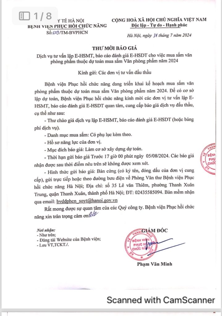 Bệnh viện Phục hồi chức năng đang triển khai kế hoạch mua sắm văn phòng phẩm thuộc dự toán mua sắm Văn phòng phẩm năm 2024. Để có cơ sở lập dự toán, Bệnh viện Phục hồi chức năng kính mời các đơn vị tư vấn lập E-HSMT, báo cáo đánh giá E-HSDT quan tâm, cung cấp báo giá dịch vụ đấu thầu, cụ thể như sau: