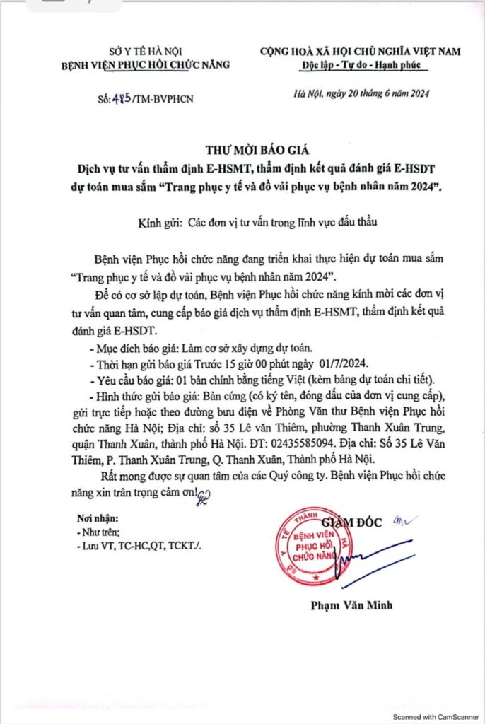Bệnh viện Phục hồi chức năng đang triển khai thực hiện dự toán mua sắm “Trang phục y tế và đồ vải phục vụ bệnh nhân năm 2024” . Để có cơ sở lập dự toán, Bệnh viện Phục hồi chức năng kính mời các đơn vị tư vấn quan tâm, cung cấp báo giá dịch vụ thẩm định E-HSMT, thẩm định kết quả đánh giá E-HSDT cụ thể như sau: