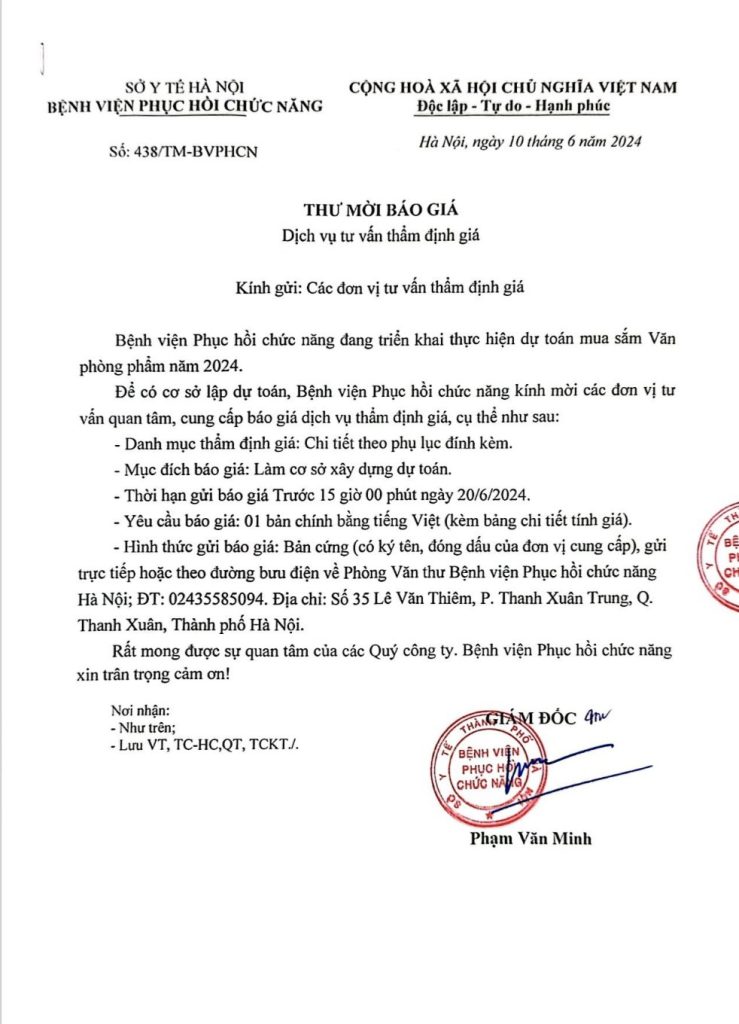 Bệnh viện Phục hồi chức năng đang triển khai thực hiện dự toán mua sắm Văn phòng phẩm năm 2024. Để có cơ sở lập dự toán, bệnh viện Phục hồi chức năng kính mời các đơn vị tư vấn quan tâm, cung cấp báo giá dịch vụ thẩm định giá, cụ thể: