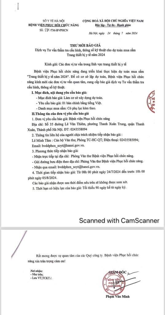 Bệnh viện Phuc hồi chức năng đang triển khai thực hiện dự toán mua sắm “Trang thiết bị y tế năm 2024”. Để có cơ sở lập dự toán, Bệnh viện Phục hồi chức năng kính mời các đơn vị tư vấn quan tâm, cung cấp báo giá dịch vụ Tư vấn thẩm tra cấu hình, thông số kỹ thuật.