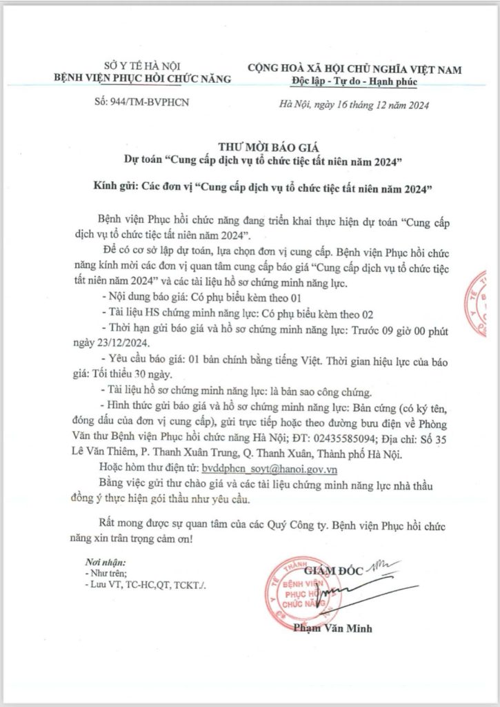 Trang chủ » Tin tức » THƯ MỜI BÁO GIÁ DỰ TOÁN CUNG CẤP DỊCH VỤ TỔ CHỨC TIỆC TẤT NIÊN NĂM 2024 THƯ MỜI BÁO GIÁ DỰ TOÁN CUNG CẤP DỊCH VỤ TỔ CHỨC TIỆC TẤT NIÊN NĂM 2024 Đăng vào ngày 16/12/2024 lúc: 16:03 1293 lượt xem Kính gửi các đơn vị cung cấp dịch vụ tổ chức tiệc tất niên năm 2024 Chi tiết file đính kèm: 16122024172431 Có thể bạn quan tâm: BỆNH VIỆN PHỤC HỒI CHỨC NĂNG THAM GIA HỘI KHỎE CÁN BỘ, CCNVLĐ NGÀNH Y TẾ HÀ NỘI NĂM 2024 (07/10/2024) Bệnh viện tổ chức huấn luyện an toàn vệ sinh lao động năm 2024 (07/01/2025) Khoa Xét nghiệm (25/09/2023) Phân biệt bệnh Parkinson và hội chứng Parkinson (28/10/2024) CHƯƠNG TRÌNH CẮT TÓC 0 ĐỒNG TẠI BỆNH VIỆN PHỤC HỒI CHỨC NĂNG HÀ NỘI (29/04/2025) 🩺 Ngày An toàn người bệnh Thế giới 17/9/2025 (17/09/2025) Khoa Chẩn đoán hình ảnh – Thăm dò chức năng (07/08/2023) THƯ MỜI QUAN TÂM: Gói thầu “Mua sắm, lắp đặt đồ gỗ và nội thất văn phòng cho khi vực khám chữa bệnh ngoại trú theo yêu cầu thuộc khoa Khám bệnh đa khoa” (17/11/2025) THƯ MỜI QUAN TÂM: Tham gia gói thầu In, photo các biểu mẫu chuyên môn, tài liệu năm 2024 (11/04/2024) 🎉 Công đoàn Bệnh viện chúc mừng sinh nhật cán bộ, nhân viên tháng 7 (07/07/2025) THƯ MỜI CUNG CẤP BÁO GIÁ (12/04/2024) Bệnh viện phục hồi chức năng hà nội tổ chức đại hội đoàn tncs hồ chí minh nhiệm kỳ 2017-2019 (26/09/2023) HƯỞNG ỨNG NGÀY THẾ GIỚI PHÒNG, CHỐNG TỰ TỬ (10/09/2025) Thư ngỏ của giám đốc (28/02/2024) NÂNG CAO HIỆU QUẢ PHỤC HỒI CHỨC NĂNG BẰNG SỬ DỤNG BÓNG THEO NHÓM CHO BỆNH NHÂN TAI BIẾN MẠCH MÁU NÃO (02/02/2024)