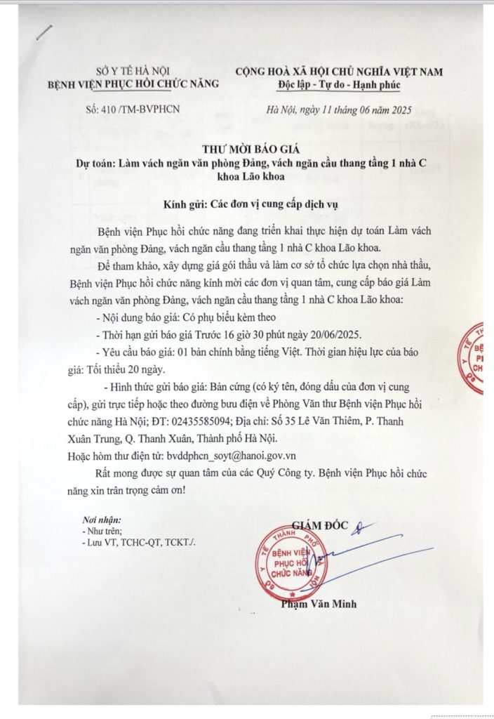 Trang chủ » Tin tức » Thông tin mua sắm - đầu tư » Thư mời báo giá Dự toán: Làm vách ngăn văn phòng Đảng, vách ngăn cầu thang tầng 1 nhà C khoa Lão Khoa Thư mời báo giá Dự toán: Làm vách ngăn văn phòng Đảng, vách ngăn cầu thang tầng 1 nhà C khoa Lão Khoa Đăng vào ngày 11/06/2025 lúc: 09:00 528 lượt xem Chi tiết báo giá: 410 Có thể bạn quan tâm: Quy trình khám bệnh không có thẻ BHYT (25/09/2023) Lịch tuần từ 04/03/2024 đến 10/03/2024 (06/03/2024) QUYẾT ĐỊNH 101/QĐ-BVPHCN QUY ĐỊNH GIÁ DỊCH VỤ KHÁM BỆNH, CHỮA BỆNH BẢO HIỂM Y TẾ (28/10/2024) YÊU CẦU BÁO GIÁ GÓI THẦU DỰ TOÁN MUA SẮM VĂN PHÒNG PHẨM (31/07/2024) Lịch tuần từ 22/04 đến 28/04/2024 (24/04/2024) CHÚC MỪNG 99 NĂM NGÀY BÁO CHÍ CÁCH MẠNG VIỆT NAM (21/6/1925 – 21/6/2024) (21/06/2024) THƯ MỜI BÁO GIÁ DỊCH VỤ TƯ VẤN THẨM ĐỊNH E-HSMT, THẨM ĐỊNH KẾT QUẢ ĐÁNH GIÁ E-HSDT DỰ TOÁN MUA SẮM “TRANG PHỤC Y TẾ VÀ ĐỒ VẢI PHỤC VỤ BỆNH NHÂN NĂM 2024” (20/06/2024) THÔNG BÁO TUYỂN SINH LỚP ÂM NGỮ TRỊ LIỆU KHOÁ 2 (26/09/2023) Khoa Xét nghiệm (25/09/2023) 30 triệu dân Việt Nam cần phục hồi chức năng (21/06/2024) THƯ MỜI CHÀO GIÁ DỊCH VỤ TƯ VẤN GIÁM SÁT CUNG CẤP VÀ LẮP ĐẶT TRANG THIẾT BỊ Y TẾ CHO VIỆC MUA SẮM TRANG THIẾT BỊ Y TẾ THUỘC DỰ TOÁN MUA SẮM TRANG THIẾT BỊ Y TẾ NĂM 2024 (05/11/2024) Lịch tuần từ 24/02 đến 02/03/2025 (27/02/2025) Thư mời báo giá Dự toán: Làm vách ngăn văn phòng Đảng, vách ngăn cầu thang tầng 1 nhà C khoa Lão Khoa (17/06/2025) Khai giảng lớp kỹ thuật viên phục hồi chức năng năm 2016 (26/09/2023) Lịch tuần từ 21/07 đến 27/07/2025 (21/07/2025)