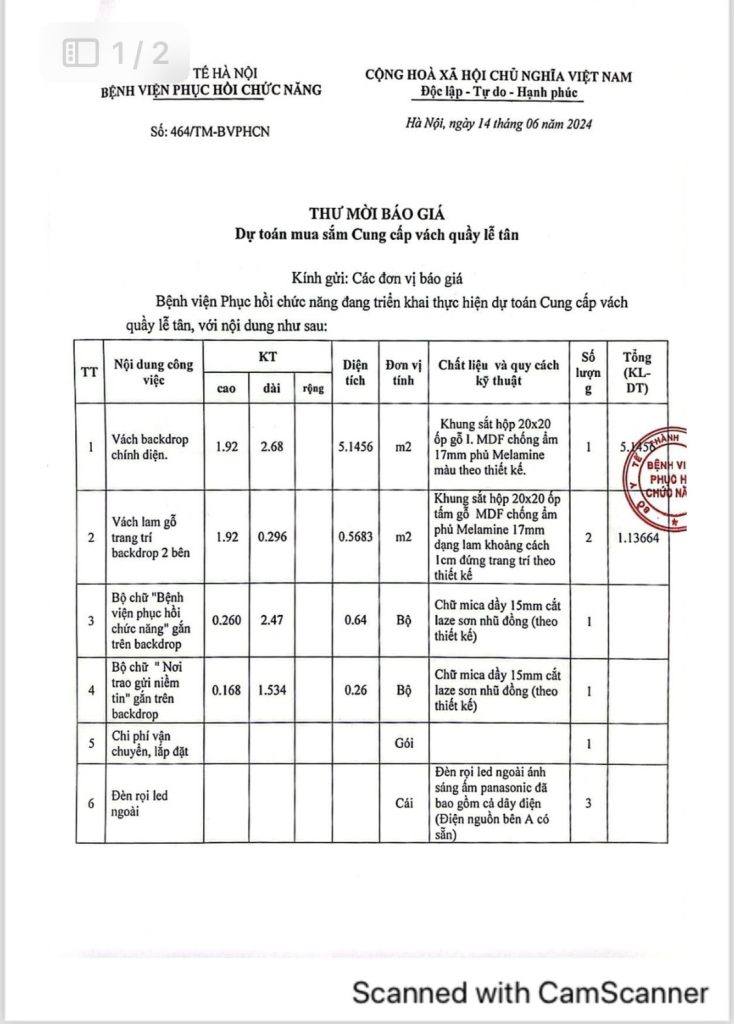 THƯ MỜI BÁO GIÁ DỰ TOÁN MUA SẮM CUNG CẤP VÁCH QUẦY LỄ TÂN