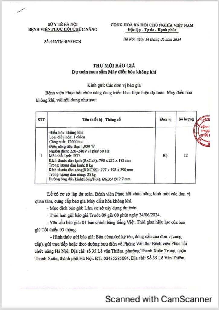 Bệnh viện Phục hồi chức năng đang triển khai thực hiện dự toán Máy điều hòa không khí, với nội dung cụ thể như sau:
