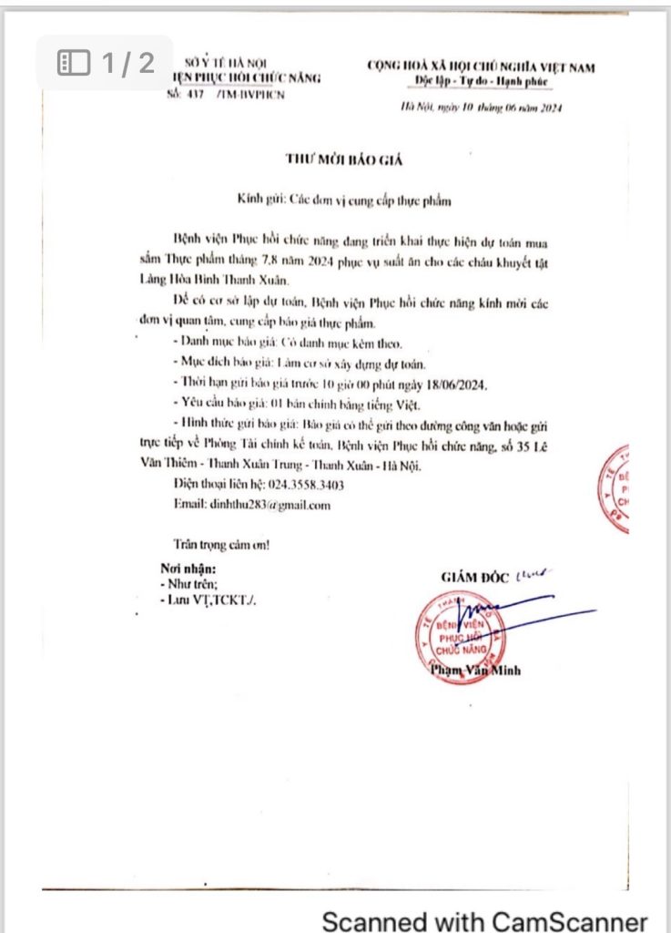 Bệnh viện Phục hồi chức năng đang triển khai thực hiện dự toán mua sắm Thực phẩm tháng 7,8 năm 2024 phục vụ suất ăn cho các cháu khuyết tật Làng Hòa bình Thanh Xuân.