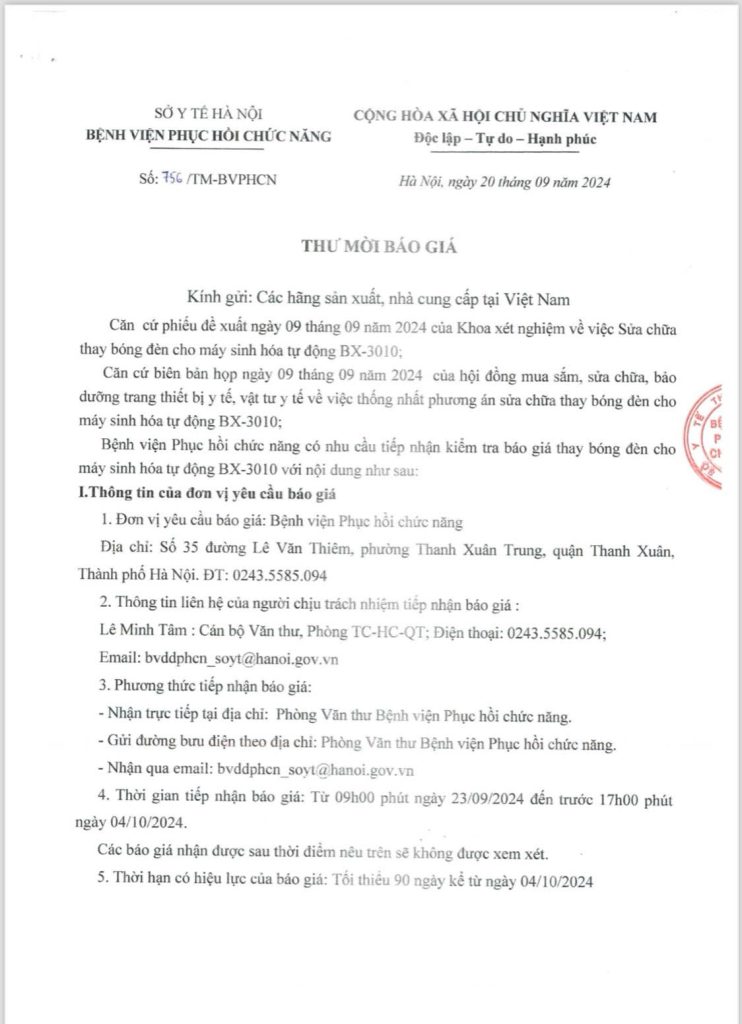 Kính gửi các hãng sản xuất, nhà cung cấp tại Việt Nam. Bệnh viện Phục hồi chức năng có nhu cầu tiếp nhận kiểm tra báo giá thay bóng đèn cho máy sinh hóa tự động BX-3010.cu thể như sau:
