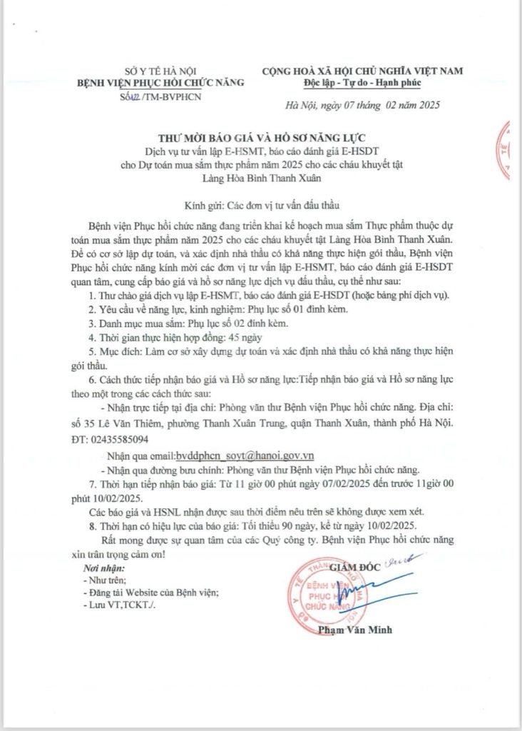 Trang chủ » Tin tức » THƯ MỜI BÁO GIÁ VÀ HỒ SƠ NĂNG LỰC DỊCH VỤ TƯ VẤN LẬP E-HSMT, BÁO CÁO ĐÁNH GIÁ E-HSDT CHO DỰ TOÁN MUA SẮM THỰC PHẨM NĂM 2025 CHO CÁC CHÁU KHUYẾT TẬT TẠI LÀNG HÒA BÌNH THANH XUÂN