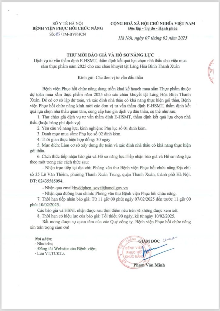 THƯ MỜI BÁO GIÁ VÀ HỒ SƠ NĂNG LỰC DỊCH VỤ TƯ VẤN THẨM ĐỊNH E-HSMT, THẨM ĐỊNH KẾT QUẢ LỰA CHỌN NHÀ THẦU CHO VIỆC MUA SẮM THỰC PHẨM NĂM 2025 CHO CÁC CHÁU KHUYẾT TẬT LÀNG HÒA BÌNH THANH XUÂN