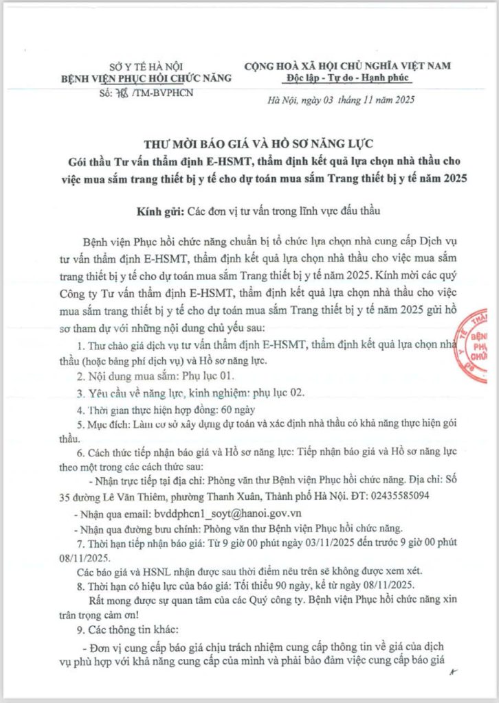 THƯ MỜI BÁO GIÁ VÀ HỒ SƠ NĂNG LỰC GÓI THẦU TƯ VẤN THẨM ĐỊNH E-HSMT, THẨM ĐỊNH KẾT QUẢ LỰA CHỌN NHÀ THẦU CHO VIỆC MUA SẮM TRANG THIẾT BỊ Y TẾ CHO DỰ TOÁN MUA SẮM TRANG THIẾT BỊ Y TẾ NĂM 2025