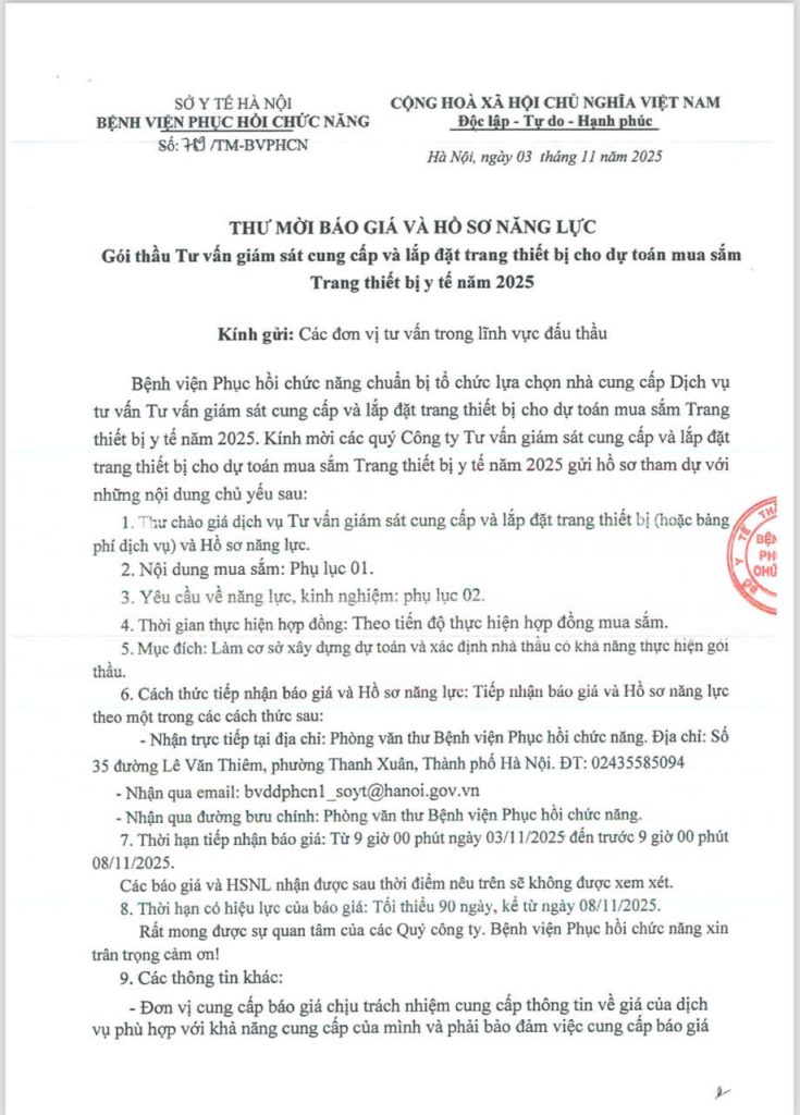 THƯ MỜI BÁO GIÁ VÀ HỒ SƠ NĂNG LWUCJ GÓI THẦU TƯ VẤN GIÁM SÁT CUNG CẤP VÀ LẮP ĐẶT TRANG THIẾT BỊ CHO DỰ TOÁN MUA SẮM TRANG THIẾT BỊ Y TẾ NĂM 2025