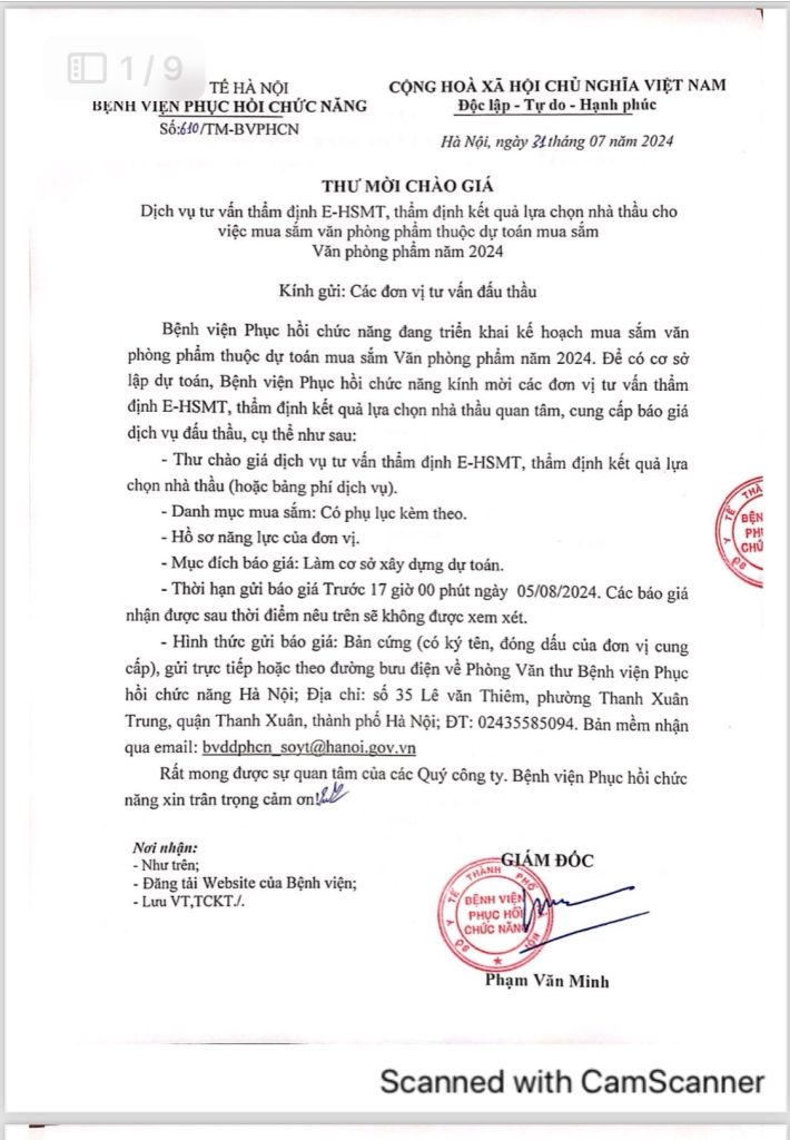 Bệnh viện Phục hồi chức năng đang triển khai kế hoạch mua sắm văn phòng phẩm thuộc dự toán mua sắm Văn phòng phẩm năm 2024, Để có cơ sở lập dự toán, Bệnh viện Phục hồi chức năng kính mời các đơn vị tư vấn thẩm định E-HSMT. thẩm định kết quả lựa chọn nhà thầu quan tâm, cung cấp báo giá dịch vụ đấu thầu, cụ thể như sau: