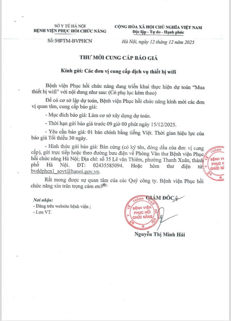 Bệnh viện Phục hồi chức năng triển khai thực hiện dự toán “Mua thiết bị wifi” với nội dung như sau: