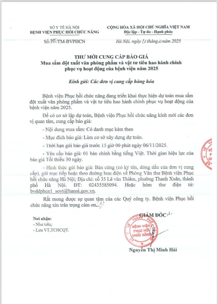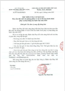 THƯ MỜI CUNG CẤP BÁO GIÁ MUA SẮM ĐỘT XUẤT VĂN PHÒNG PHẨM VÀ VẬT TƯ TIÊU HAO HÀNH CHÍNH PHỤC VỤ HOẠT ĐỘNG CỦA BỆNH VIỆN NĂM 2025