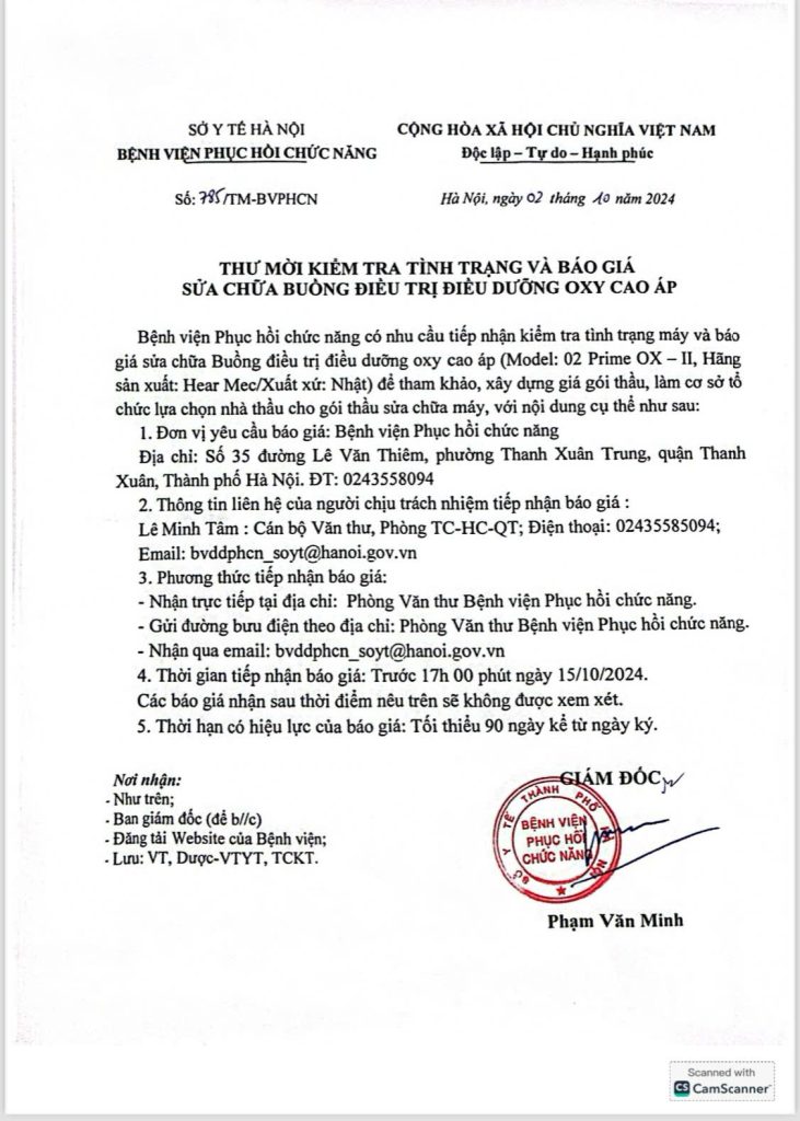 Bệnh viên Phục hồi chức năng có nhu cầu tiếp nhận kiểm tra tình trạng máy và báo giá sửa chữa buồng điều trị điều dưỡng oxy cao áp như sau:
