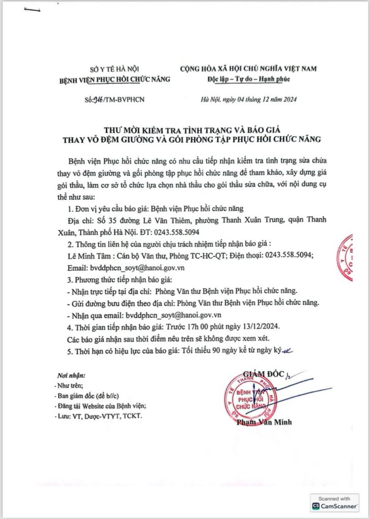 Bệnh viện Phục hồi chức năng có nhu cầu tiếp nhận kiểm tra tình trạng sửa chữa thay vỏ đệm giường và gối phòng tập phục hồi chức năng để tham khảo, xây dựng giá gói thầu, làm cơ sở tổ chức lựa chọn nhà thầu cho gói thầu sửa chữa, với nội dung cụ thể như sau: