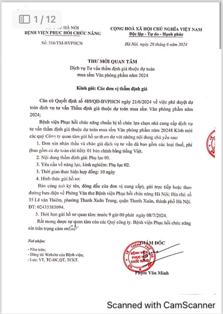 Bệnh viện Phục hồi chức năng Hà Nội kính gửi thư mời quan tâm dịch vụ tư vấn thẩm định giá thuộc dự toán mua sắm văn phòng năm 2024.