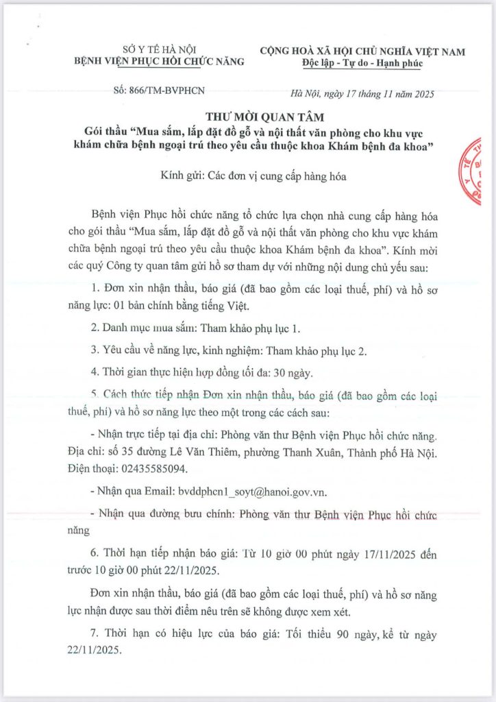 THƯ MỜI QUAN TÂM: Gói thầu “Mua sắm, lắp đặt đồ gỗ và nội thất văn phòng cho khi vực khám chữa bệnh ngoại trú theo yêu cầu thuộc khoa Khám bệnh đa khoa”