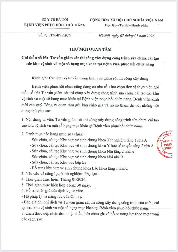 THƯ MỜI QUAN TÂM Gói thầu số 3: Tư vấn giám sát thi công xây dựng công trình sửa chữa, cải tạo các khu vệ sinh và một số hạng mục khác tại Bệnh viện Phục hồi chức năng