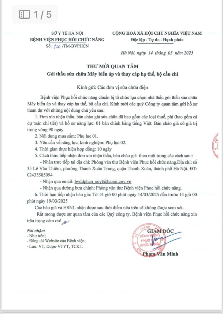 Trang chủ » Tin tức » THƯ MỜI QUAN TÂM GÓI THẦU SỮA CHỮA MÁY BIẾN ÁP VÀ THAY CÁP HẠ THẾ, BỘ CẦU CHÌ THƯ MỜI QUAN TÂM GÓI THẦU SỮA CHỮA MÁY BIẾN ÁP VÀ THAY CÁP HẠ THẾ, BỘ CẦU CHÌ Đăng vào ngày 14/03/2025 lúc: 11:07 741 lượt xem Bệnh viện Phục hồi chức năng kính gửi các đơn vị sửa chữa điện: Chi tiết File đính kèm: so 230.TM-BVPHCN Có thể bạn quan tâm: Bệnh viện phục hồi chức năng mang yêu thương đến cho trẻ em khuyết tật (26/09/2023) PHỤC HỒI CHỨC NĂNG GIÚP BỆNH NHÂN TIM MẠCH SỐNG KHỎE MẠNH (08/03/2024) TẬP HUẤN VÀ BÌNH BỆNH ÁN CHUYÊN ĐỀ “ỨNG DỤNG ĐIỀU TRỊ OXY CAO ÁP TRONG LÂM SÀNG PHỤC HỒI CHỨC NĂNG” (26/11/2024) THƯ MỜI BÁO GIÁ DỊCH VỤ TƯ VẤN THẨM ĐỊNH GIÁ DỰ TOÁN MUA SẮM “TRANG PHỤC Y TẾ VÀ ĐỒ VẢI PHỤC VỤ BỆNH NHÂN NĂM 2024” (20/06/2024) Lịch tuần từ ngày 19/02/2024 đến 25/02/2024 (20/02/2024) THƯ MỜI YÊU CẦU BÁO GIÁ GÓI THẦU DỰ TOÁN MUA SẮM MÁY TÍNH ĐỂ BÀN, MÁY IN NĂM 2024 (01/08/2024) THÔNG BÁO Kết quả lựa chọn nhà thầu gói thầu mua sắm, lắp đặt đồ gỗ và nội thất văn phòng cho khu vực khám chữa bệnh ngoại trú theo yêu cầu thuộc Khoa khám bệnh đa khoa (23/11/2025) YÊU CẦU BÁO GIÁ DỊCH VỤ SỬA CHỮA TRẠM BIẾN ÁP (11/12/2024) THƯ MỜI KIỂM TRA TÌNH TRẠNG VÀ BÁO GIÁ SỬA CHỮA NỒI HẤP TOMMY (21/05/2024) Lịch tuần từ 02/12 đến 08/12/2024 (02/12/2024) Lịch tuần 25/8 đến 31/8/2025 (26/08/2025) 🕊 Khám sức khỏe cho đối tượng chính sách nhân kỷ niệm 78 năm Ngày Thương binh – Liệt sĩ (25/07/2025) Lịch tuần từ 27/10 đến 02/11/2025 (26/10/2025) Đoàn viên Công đoàn Bệnh viện Phục hồi chức năng Hà Nội tích cực tham gia ngày hội hiến máu tình nguyện (08/05/2024) Bệnh viện tổ chức huấn luyện an toàn vệ sinh lao động năm 2024 (07/01/2025)