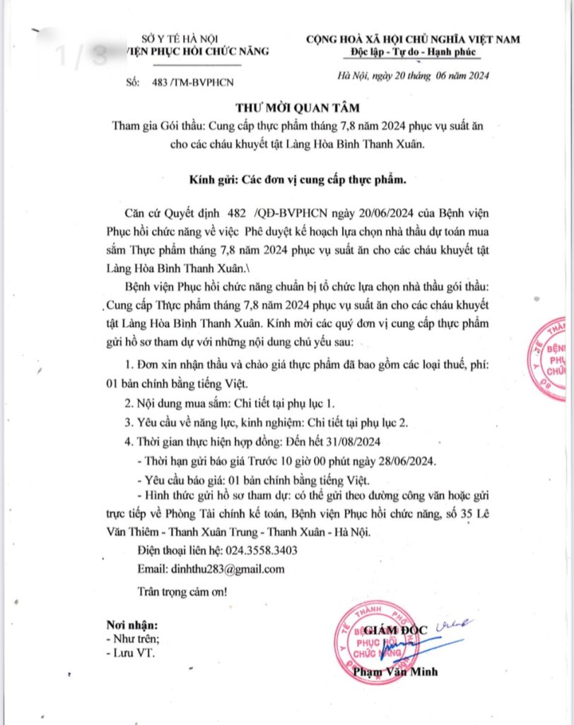 KÍNH GỬI CÁC ĐƠN VỊ CUNG CẤP THỰC PHẨM THƯ MỜI QUAN TÂM THAM GIA GÓI THẦU : CUNG CẤP THỰC PHẨM THÁNG 7-8 NĂM 2024 PHỤC VỤ SUẤT ĂN CHO CÁC CHÁU KHUYẾT TẬT LÀNG HÒA BÌNH THANH XUÂN