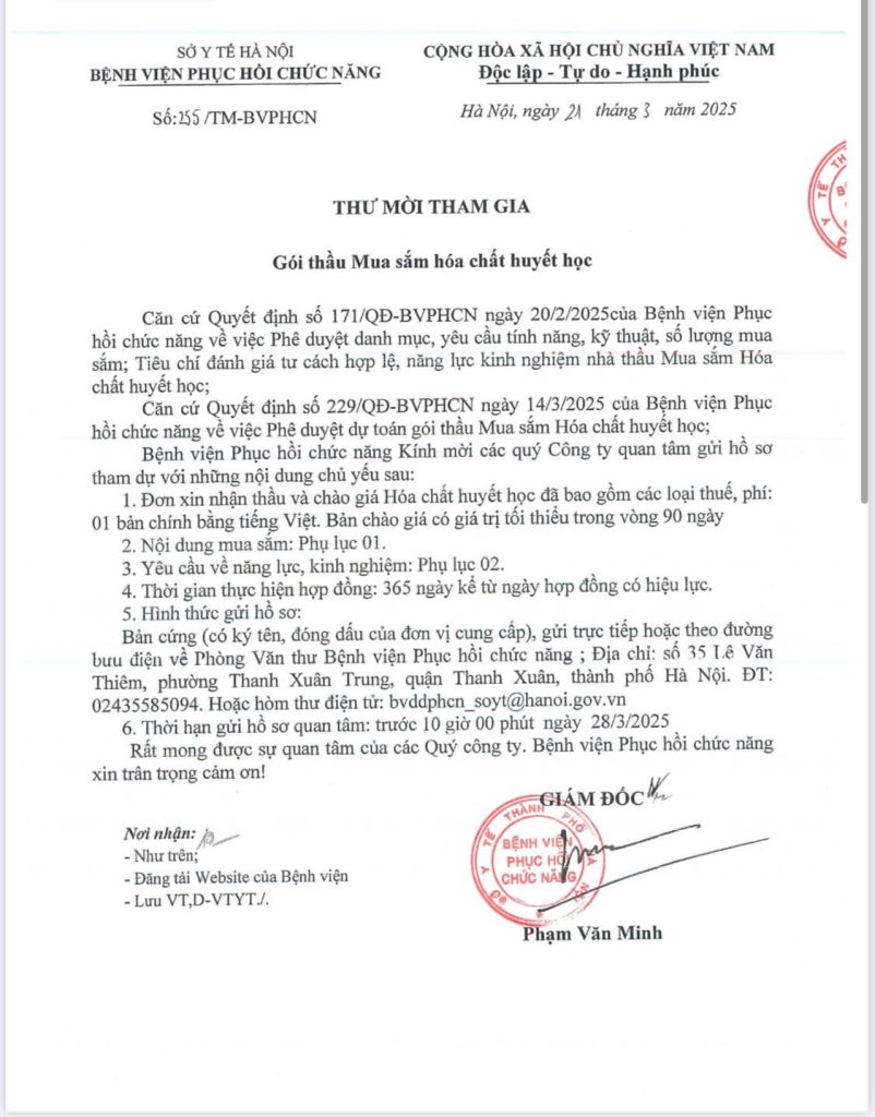 Trang chủ » Tin tức » Thông tin mua sắm - đầu tư » Thư mời tham gia Gói thầu Mua sắm hóa chất huyết học Thư mời tham gia Gói thầu Mua sắm hóa chất huyết học Đăng vào ngày 21/03/2025 lúc: 09:33 1195 lượt xem Chi tiết gói thầu: 21032025121629 Có thể bạn quan tâm: Bệnh viện Phục hồi chức năng Hà Nội tiếp nhận Tình nguyện viên phái cử thuộc Cơ quan hợp tác quốc tế Nhật Bản (JICA) đến làm việc tại bệnh viện. (25/07/2024) Thư mời báo giá: Dịch vụ Tư vấn thẩm tra cấu hình, thông số kỹ thuật cho dự toán mua sắm Trang thiết bị y tế năm 2025 (31/07/2025) Lịch tuần từ 03/06/2024 đến 09/06/2024 (04/06/2024) Hiệu quả rõ rệt của phương pháp tiêm Botulinum toxin A lên điều trị co cứng cơ cho trẻ Bại não (07/10/2024) Khoa khám bệnh đa khoa (01/03/2024) Lịch tuần từ 10/06 đến 16/06/2024 (07/06/2024) Tập huấn đổi mới phong cách giao tiếp ứng xử cho nhân viên y tế (26/09/2023) HỘI CỨU TRỢ TRẺ EM KHUYẾT TẬT THÀNH PHỐ HÀ NỘI ĐẾN CHÚC MỪNG BỆNH VIỆN PHỤC HỒI CHỨC NĂNG NHÂN NGÀY THẦY THUỐC VIỆT NAM 27/2 (26/02/2024) THƯ MỜI BÁO GIÁ DỰ TOÁN MUA SẮM MÁY TÍNH, MÁY IN NĂM 2024 (17/06/2024) THƯ CẢM ƠN (19/11/2024) Lễ kỷ niệm 70 năm Ngày thầy thuốc Việt Nam (27/2/1955 – 27/2/2025) (28/02/2025) QUYẾT ĐỊNH PHÊ DUYỆT KẾT QUẢ ĐƠN VỊ THỰC HIỆN GÓI THẦU SỐ 6: TƯ VẤN GIÁM SÁT CUNG CẤP VÀ LẮP ĐẶT TRANG THIẾT BỊ Y TẾ DỰ TOÁN MUA SẮM TRANG THIẾT BỊ Y TẾ NĂM 2025 (21/11/2025) THƯ MỜI BÁO GIÁ VÀ HỒ SƠ NĂNG LWUCJ GÓI THẦU TƯ VẤN GIÁM SÁT CUNG CẤP VÀ LẮP ĐẶT TRANG THIẾT BỊ CHO DỰ TOÁN MUA SẮM TRANG THIẾT BỊ Y TẾ NĂM 2025 (03/11/2025) Lịch tuần 29/9 đến 05/10/2025 (03/10/2025) THƯ MỜI BÁO GIÁ VÀ HỒ SƠ NĂNG LỰC DỊCH VỤ TƯ VẤN THẨM ĐỊNH E-HSMT, THẨM ĐỊNH KẾT QUẢ LỰA CHỌN NHÀ THẦU CHO VIỆC MUA SẮM THỰC PHẨM NĂM 2025 CHO CÁC CHÁU KHUYẾT TẬT LÀNG TRẺ HÒA BÌNH THANH XUÂN (17/12/2024)